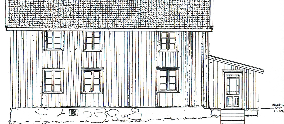 Proporsjoner og materialvalg er viktig. Det må virke harmonisk. Vi ringte etter bygningsantikvar Ragnar Kristensen i Larvik. Han har tegnet et liknende bislag til kjøkkeninngangen på Yttersø gård, som han selv eier. Vi likte det umiddelbart da vi så bildene han sendte. Gode proporsjoner og fin takvinkel. For Bekken fantes det imidlertid ingen tegninger. Derfor måtte vi starte med det helt grunnleggende, nemlig å måle opp den eksisterende bygningen. Kristensen tok turen fra Larvik, og arbeidet var gjort i løpet av et par sure høstdager i 2018. Jeg holdt målbåndet, Ragnar Kristensen leste av mål og noterte. Deretter ble huset med alle dets skjevheter tegnet ut, fasade for fasade og i plan.