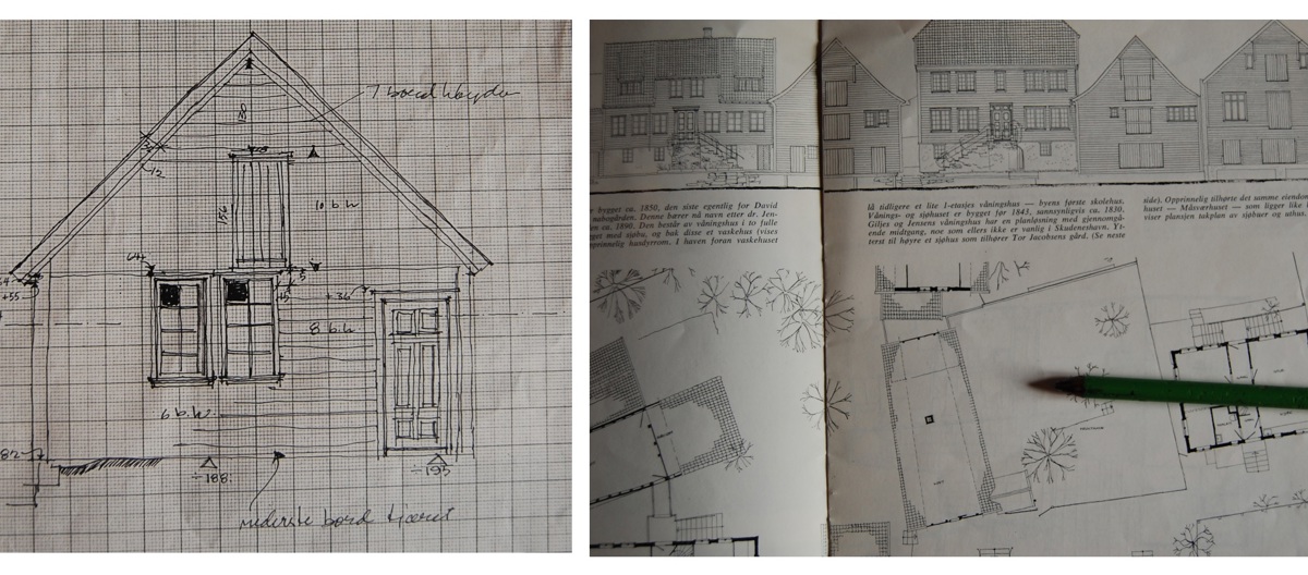Eieren sine tegninger av bygget, legg merke til forskjellen i takvinkel på gavlene. Foto: Trond Oalann