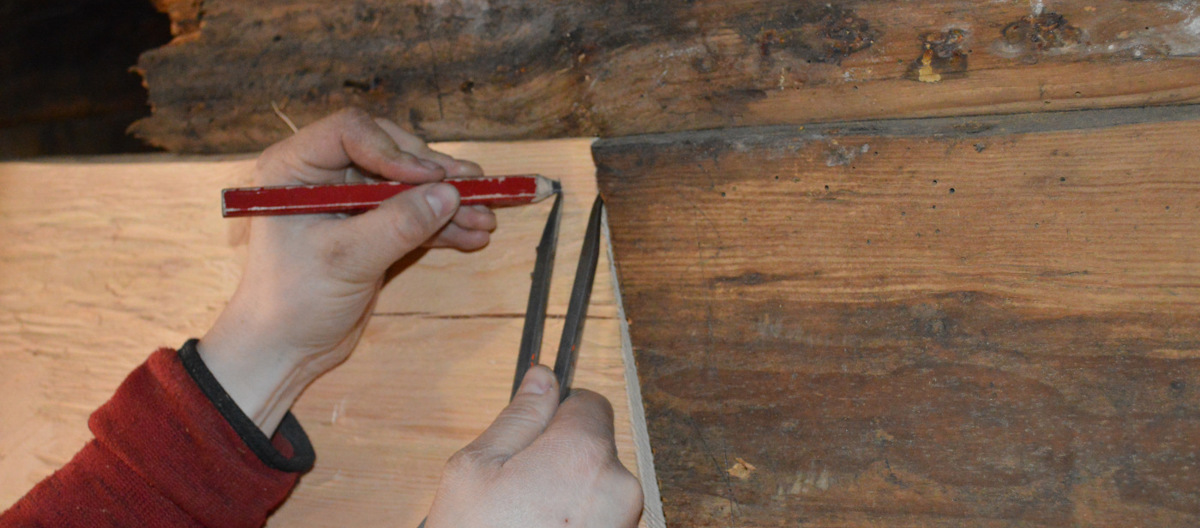 Undersiden er ferdig tilpasset. Neste steg er å tilpasse oversiden mot det gamle laftet. For å ha kontroll på stokkens plassering sidelengs skrur vi på et loddbord og en kloss.