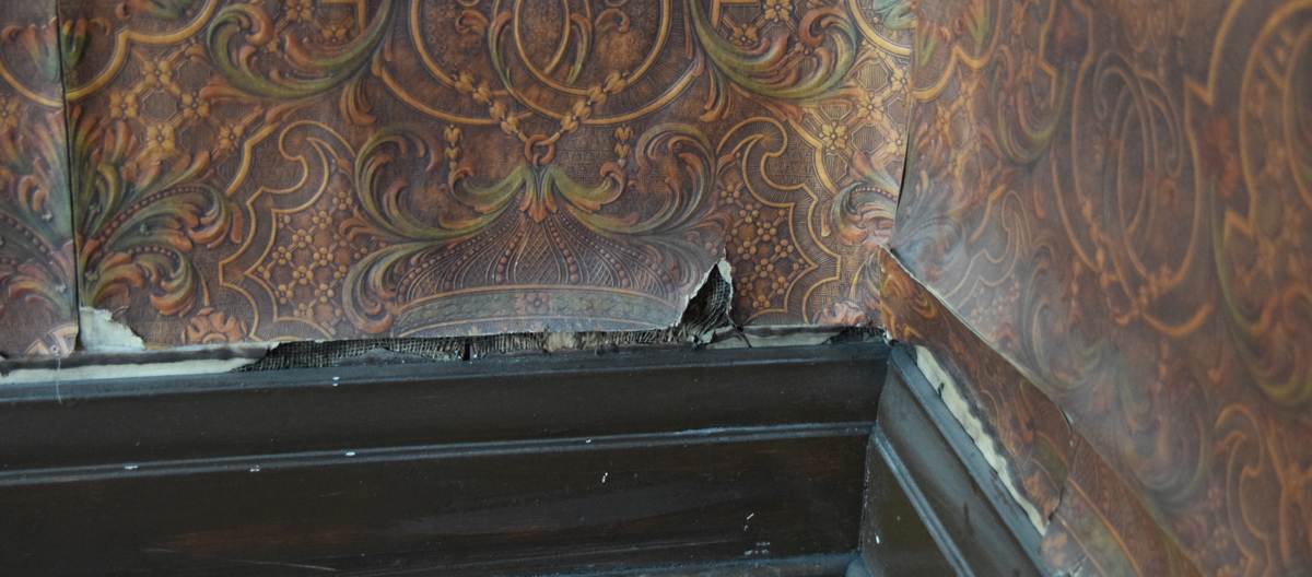 Eksempel på en annen skade. Tapetet er i ferd med å miste festet, både oppe ved taklisten og nede ved gulvet. Dette skaper spenninger og forårsaker sprekker. Legg også merke til at pappen under har fargespor. Dette indikerer at hele tapetet etter montering ble behandlet med en skjellakk. Men hvorfor det?