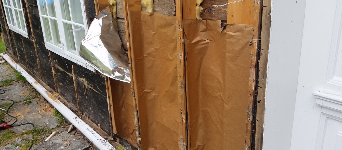 - Innvendig ble det lagt to krysslagte lag med panel med uimpregnert papp imellom.