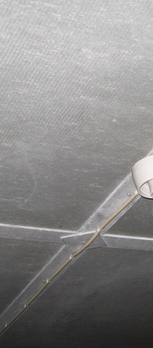Eternitt (asbest) i himling i kjeller. I mange kjellere, og spesielt der det har stått en oljefyr, er det eternitt i taket. Disse platene er satt opp fordi de er gode brannskiller. De er ikke farlige å la stå - men hvis du maler dem så må fremtidige eiere informeres om at de finnes der! De er nemlig farlige når man begynner å rive dem ned. Eternitt (asbest) er et materiale som består av mange skarpe, tynne fibre. Disse er svært kreftfremkallende og farlig å håndtere og puste inn. Demontering av slike tak bør derfor utføres av bedrift med kurs og riktig sikkerhetsutstyr. Foto: Steinar Amlo, Norconsult AS