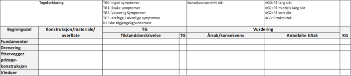 En tilstandsanalyse er en vurdering av bygget, og tilstanden på de ulike bygningsdelene i bygget. For å være sikker på at man får med seg alle elementer, bør man følge standarden som er utarbeidet for dette; NS-EN 16096:2012 Bevaring av kulturminner - Tilstandsanalyse av fredete og verneverdige bygninger. Denne standarden kan også benyttes selv om bygget ikke er underlagt et formelt vern, og gir gode retningslinjer på hva man skal se etter på et eldre bygg.