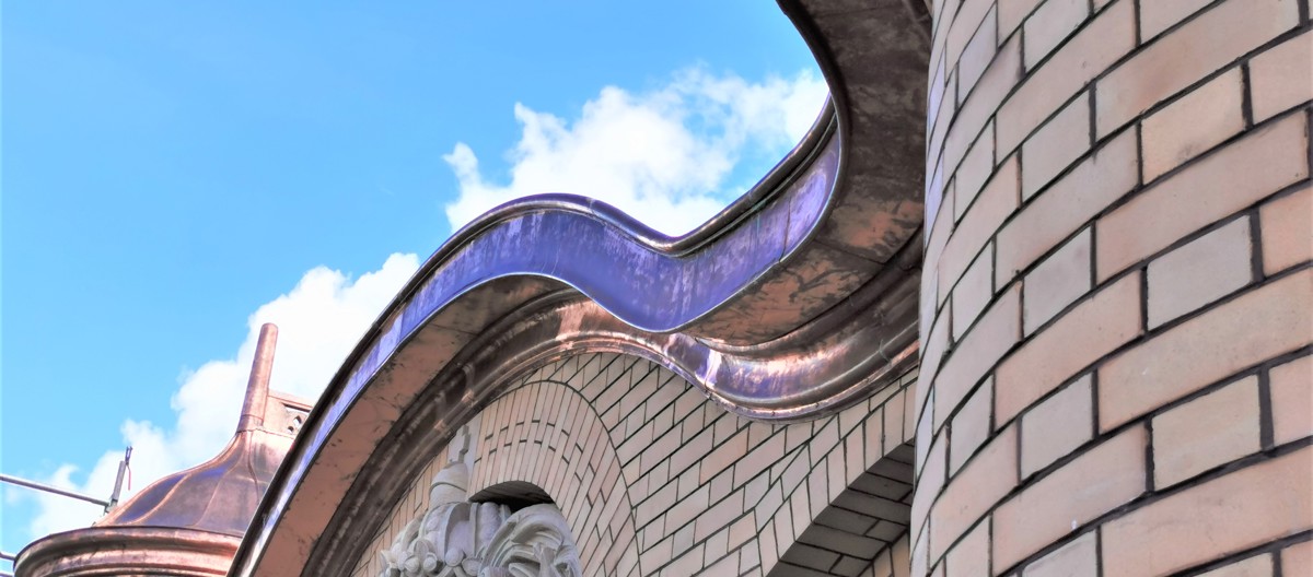Originale tegninger fra Henrik Bull ble funnet på arkitekturmuseet og kopiert. Disse tegninger ble etter hvert brukt av håndverkerne for å rekonstruere detaljene i kobbertekkingen. Ut fra dem laget blikkenslagerne nye hetter over ventiler, lufthatter, takrenner og nedløpskummer. Alt utformet med tanke på å være en del av arkitekturen og ornamenteringen. Taket er ellers skivetekket, i alt 1750 kvadratmeter med kobbertekking. Også gesimsen som alene er 220 løpemeter, er tekket med kobber. En rekke av detaljene, slik som nedløpskummer og krummede vanrenner er banket ut av kobberplater.
