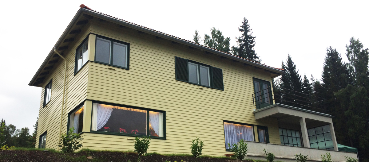 Huset har tydelig funkis-preg, med helvalmet tak, liggende vestlandspanel, vinduer trukket ut mot hushjørnene og terrasser og altaner med stålrekkverk som understreker den horisontale linjeføringen i fasadene.