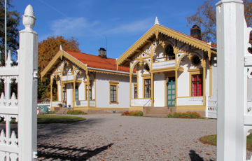 Peter Andreas Blixs villa fra 1872 , med tidstypisk sammensatt form og rik detaljering. Den nygotiske verandaens avrundede buer er dannet av påføringer på de rettlinjede bjelkene. Foto: Jens Christian Eldal.