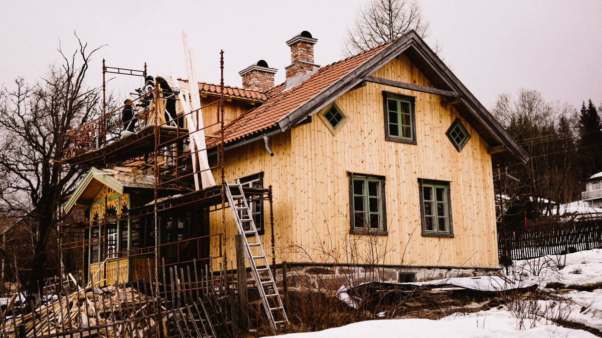 Arbeider på "baksiden" av Nordengen. Et større utbygg på taket enn på "forsiden" hvor vi finner viftevinduet. Deler av huset var kledd med panel, som nå er erstattet av ny. Foto: Bygg og Bevar
