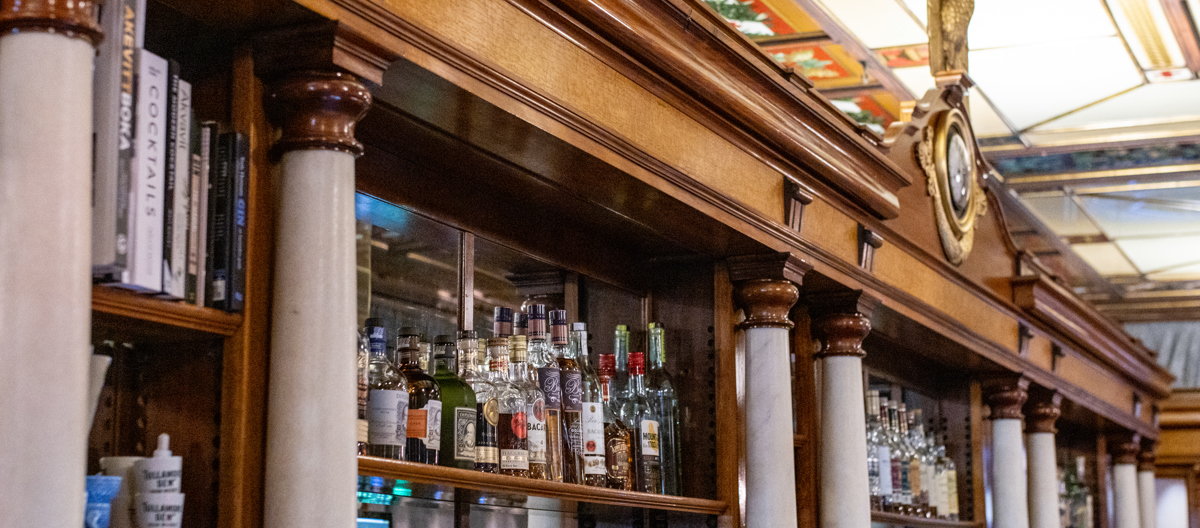 Folk haster forbi på utsiden, men her inne er det lunt med dempet belysning. Ved enkelte av bordene sitter det folk i lavmælte samtaler. Innredningen må være byens mest påkostede i mahogni med marmorsøyler, gamle keramikkfliser på gulvet og et malt glasstak. Originalt alt sammen.