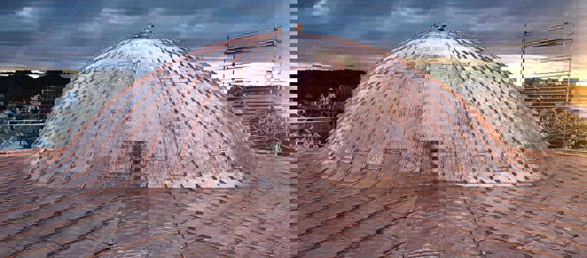 Trearbeidene på taket ble utført av Byggmesterkompaniet AS, ved tømrer Anders Steinnes, som gjorde en strålende jobb. ikke minst på kuppelen. Deretter begynte blikkenslagerne med kobbertekkingen. Underveis er det arbeidet med flotte false og tekkemetoder, samt strekking og krymping av kobberen!