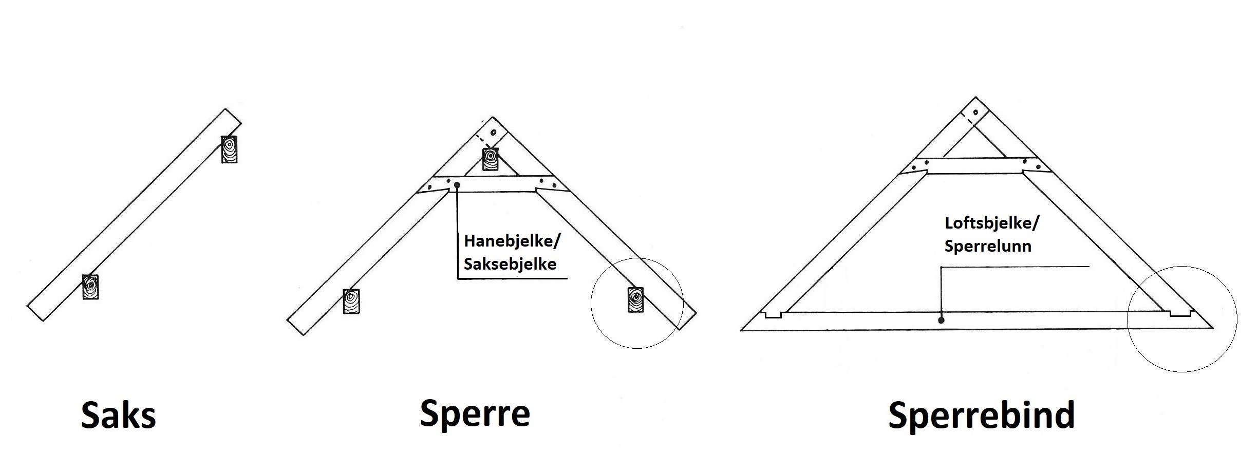 Takkonstruksjon der taklastene blir tatt opp av tettstilte sperrer og lastene ført ned til grunn gjennom takstoler og bærevegger.