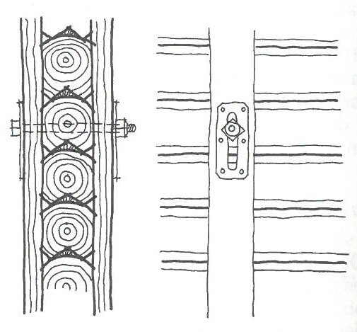 Loddrett stokker parallelt på begge sider av en laftevegg, med gjennomgående bolter. Fungerer som avstivning av lange eller høye vegger.