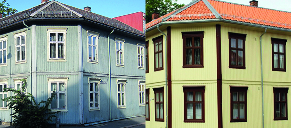 HISTORISKE FARGER: Ny drakt, gamle farger. Johnny Spangen hos Miljømal lette i lagene, og fant gulfargen til kledningen; S 1515-Y. Nye vinduer er tro kopier av de originale, malt i S 7020-Y70R. (Foto: Boligbygg Oslo KF)