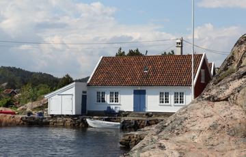 Sjøhus og naust ble bygget med gavlen mot sjøen for å gi flest tilgang til den gode havnen. Sistmann på rekka fikk en langside på kjøpet. Foto: Bygg og Bevar