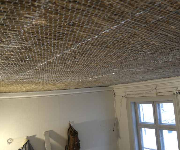 Når himlingen skulle repareres/restaureres ble det vurdert som riktig å etablere en pussbærer som kunne tåle de nye påkjenningene som nå var hverdagen til dette bygget. Det ble valgt å bruke rørvev og hønsenetting. Rørvev stemmer med byggeskikken i perioden bygget er fra, men ble tydeligvis ikke brukt i utførelsen av denne himlingen. Men det ble funnet rørvev bak stukklistene så det var åpenbart i bruk. Hønsenettingen ble valgt som en ekstra forsterkning mot rystninger. Foto: NKHN