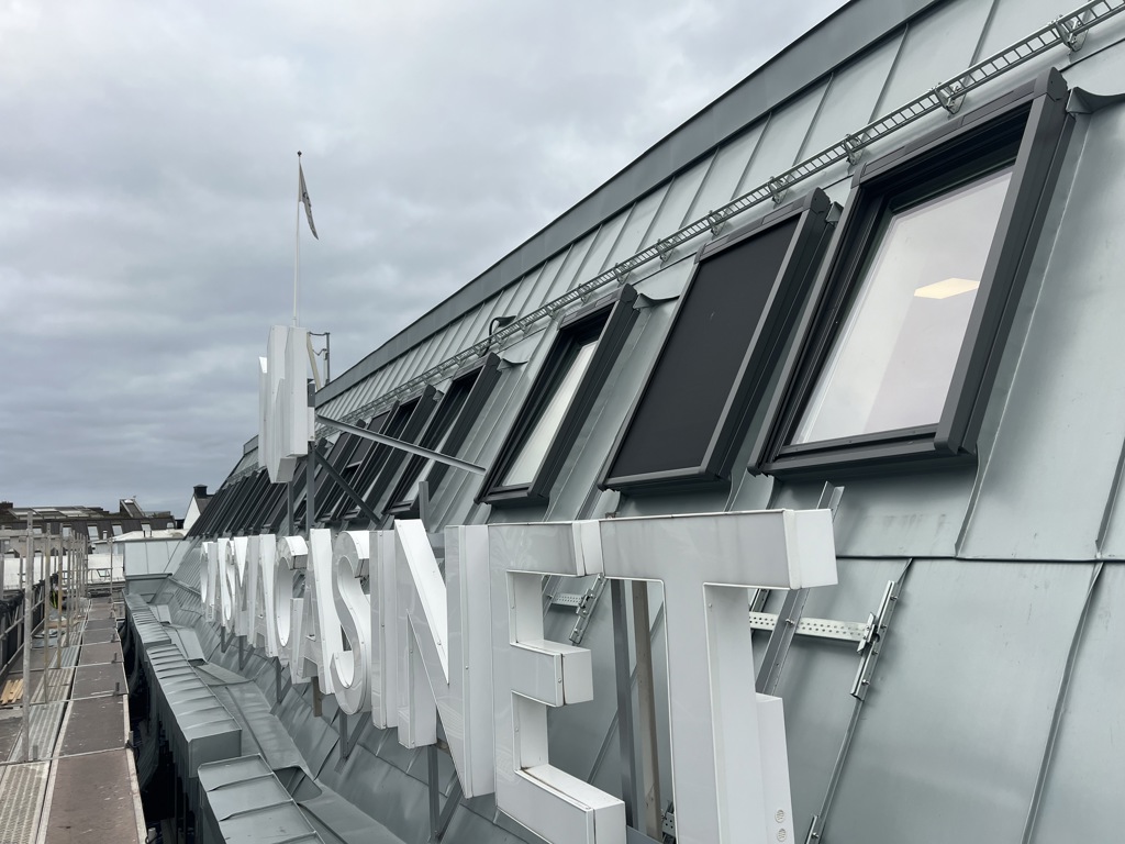 – Den nye taktekkingen består av patinert Rheinzink i en elegant blågrå farge, som er et utmerket valg for såpass historiske bygninger. Vi rev den gamle ståltekkingen som tidligere har vært malt gjentatte ganger. Deretter demonterte vi underlagsbelegget og la nytt. Underlagsbelegget og strukturmatta vil gi ekstra beskyttelse under den nye sinktekkingen med god avrenning, og vi sørger alltid for å bruke strukturmatte uansett hellingsgrad i taket. Dette sikrer en solid og holdbar løsning, GLASSMAGASINET – skiltene ble demontert, sandblåst og laget ny innfesting som ble tilpasset falsene som det ble festet i, tidligere var det skrudd gjennom tekkingen sier Kristiansen.