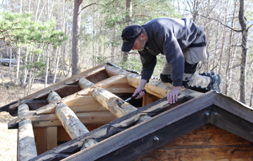 - Det er viktig at dette blir nøye. Vi bruker spiker slik som i det gamle taket, og gode tilpasninger gir et sterkt tak. Ved å bruke rundtømmer på denne måten sparer vi mye unødig tilhogging. I forhold til større firkantet trelast fra sag, har de små stokkene stor styrke. Som rundtømmer er fibrene på yttersida i behold, mens mye telging eller flater fra sag svekker stokken ganske mye, sier Eddie Andersen.