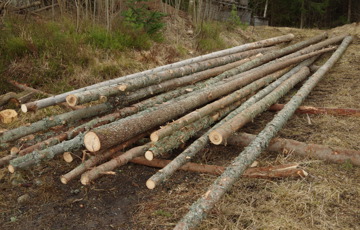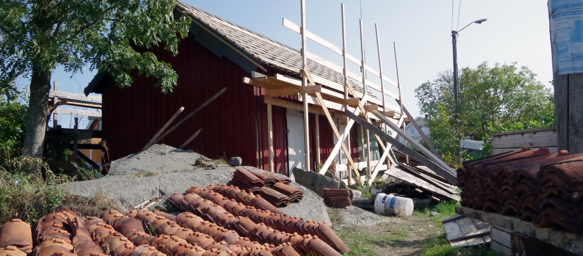 Han hentet rundtømmeret, og fikk kappet det så det best mulig passet for taket på garnbua. Så ble tømmeret barka og lagret for tørk gjennom sommeren, før den første delen av taket ble skiftet utpå seinvinteren.