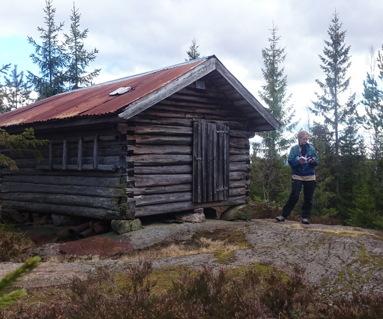 På innsida ser en at enda mindre rundtømmer er lagt tett, med noe mose i mellom. På ei lita koie var ble takflata så stiv nok at en slapp stendere inne i rommet. Trolig har det vært spon på taket, før bølgeblikk kom på plass. Foto: Per Øyvind Berg