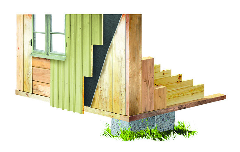 Ved oppførelsen ble rammeverket satt opp først, så takkonstruksjonen og til slutt ble plankene tredd inn og drevet sammen etter tørking. Plankene hadde ofte not og fjær for å tette godt – det var viktig for en tett vegg. Stolpene, losholtene og svillene hadde spor som tilsvarte tapper i hver ende på plankene. Disse sikret at delene ble holdt sammen og at veggen ble tett. Plankene ble satt i plan med veggens innside, på yttersiden var det derved plass for kryssavstiverne som ble montert etter at plankene var på plass. På begge sider av plankene ble det montert papp. Veggene ble panelt utvendig og panel eller plater innvendig.