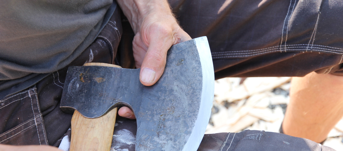- Du kan høre når eggen er skarp. Ingen får komme nær øksa, det er ikke lov for lærlingen å bryne øksa til mesteren. Det kan se rustent ut, men det betyr ikke at verktøyet ikke jobber mykt og smidig i treet.