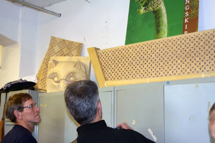 Christen Dokk Smith (til venstre) er ferdig i snekkerlæra om et halvt år. Han er lærling på Vikingeskipsmuseet, og tok dem som ville med over for et besøk i verkstedet. Her kopieres museets gjenstander, til studier andre steder og som sikkerhetskopier.