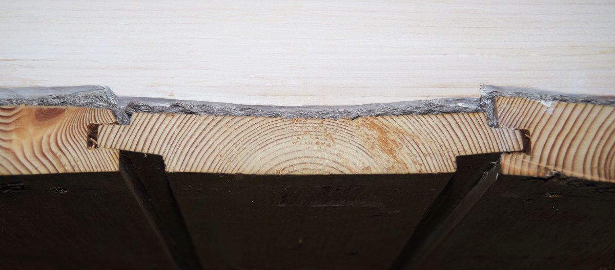 Bord i himling i hus fra ca 1830. Snitt i endeveden viser årringbredder på 2-4 mm. Legg merke til hvor kraftige årringene er. Dette er typisk for trær som har stått åpent, som på en ås eller i en skog som er glissen. Bordene er fra oppgangssag og er håndhøvlet. De smalner av på samme måte som stokken de kom fra.