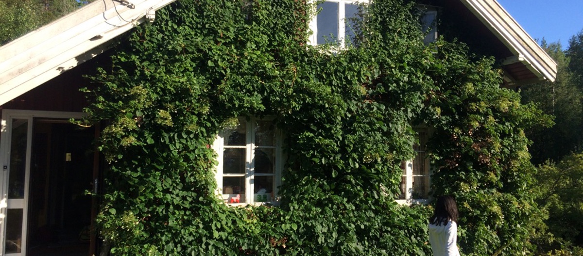 Det kommer til et punkt hvor det har blitt for mye grønt. Huset har ikke godt av så mye vegetasjon tett på veggen. Det kan lett bli fukt, og det er vanskelig å male eller oppdage skader. Foto: Anne Beate Rye Teigen