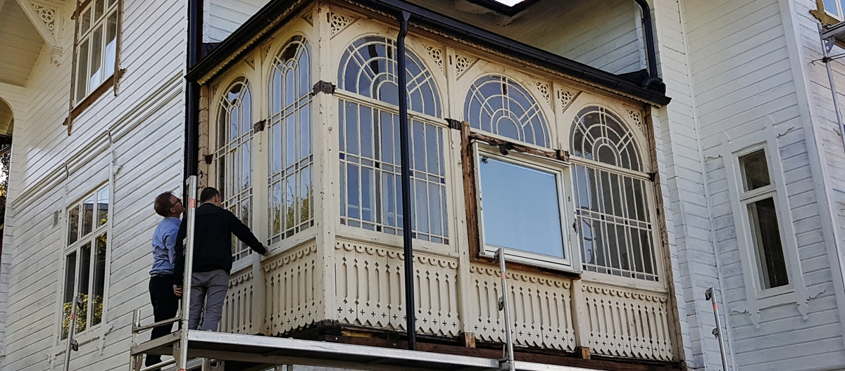 Gjennom årene gjennomgikk huset moderniseringer som var vanlige i etterkrigstiden. Det gikk utover sveiterstilens karakteristiske snekkerglede og glassverandaer. Da de nåværende eiere overtok var glassverandaen borte og det eneste vinduet som sto igjen var et stort husmorvindu. Men kunne det være at noe sto igjen bak kledningen?