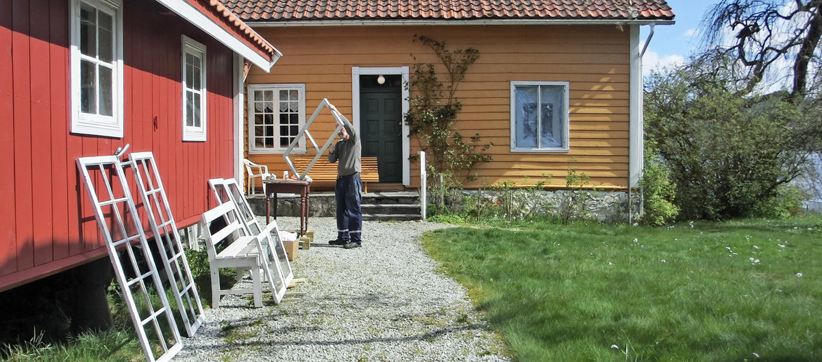 Prima vær! Og arbeidet kan gjøres ute. Legg merke til bulkene i vindusglasset. Det er et adelsmerke! Foto: Øyvind Johnsen