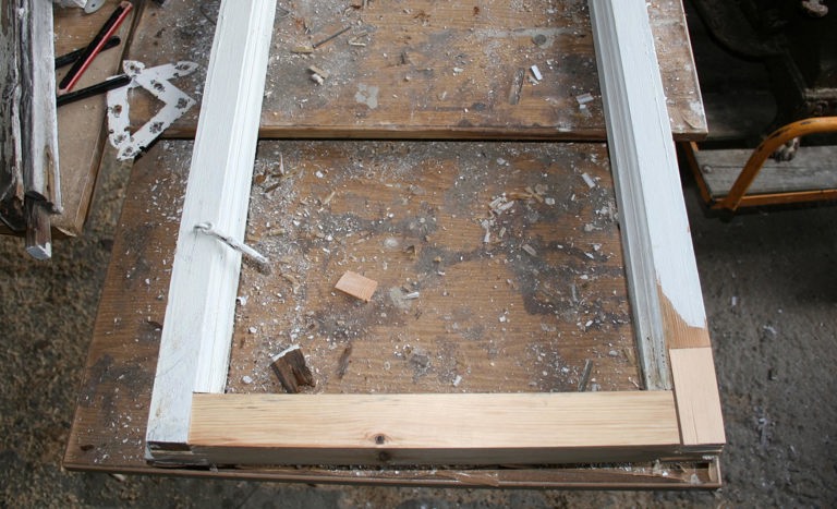 Vindusåpningene hadde ikke lenger helt rette diagonaler. Vi målte opp skjevhetene ved hjelp av en løs plate, og tilpasset målene på rammen som vinduene skal inn i.
