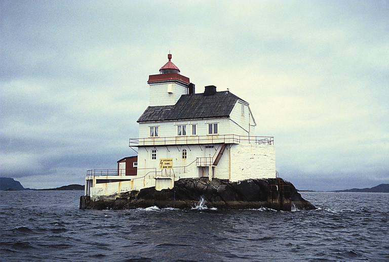 Et ledfyr som viser vei innaskjærs. Bygningene på Stabben fyrstasjon dekker nesten hele holmen, så her er det ikke mye plass å boltre seg på. Dette er et såkalt ledfyr, som er mindre fyr som viser vei i indre farvann, mellom holmer og skjær og ved innseilingen til trange sund. Foto: Danckert Monrad-Krohn, Riksantikvaren