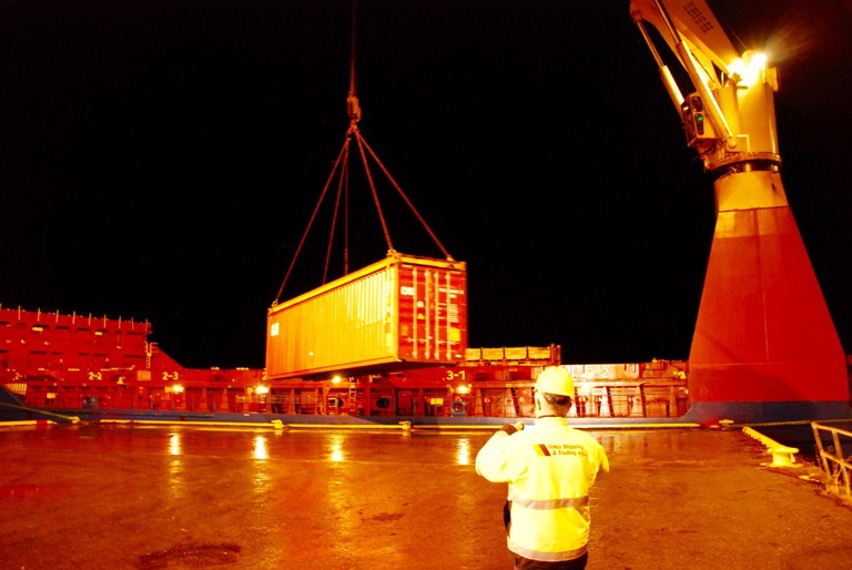 Alle bygningselementene får plass i tre konteinere. Det var rundt 30 grader under demonteringsarbeidet. Inne i konteineren var det varmere.